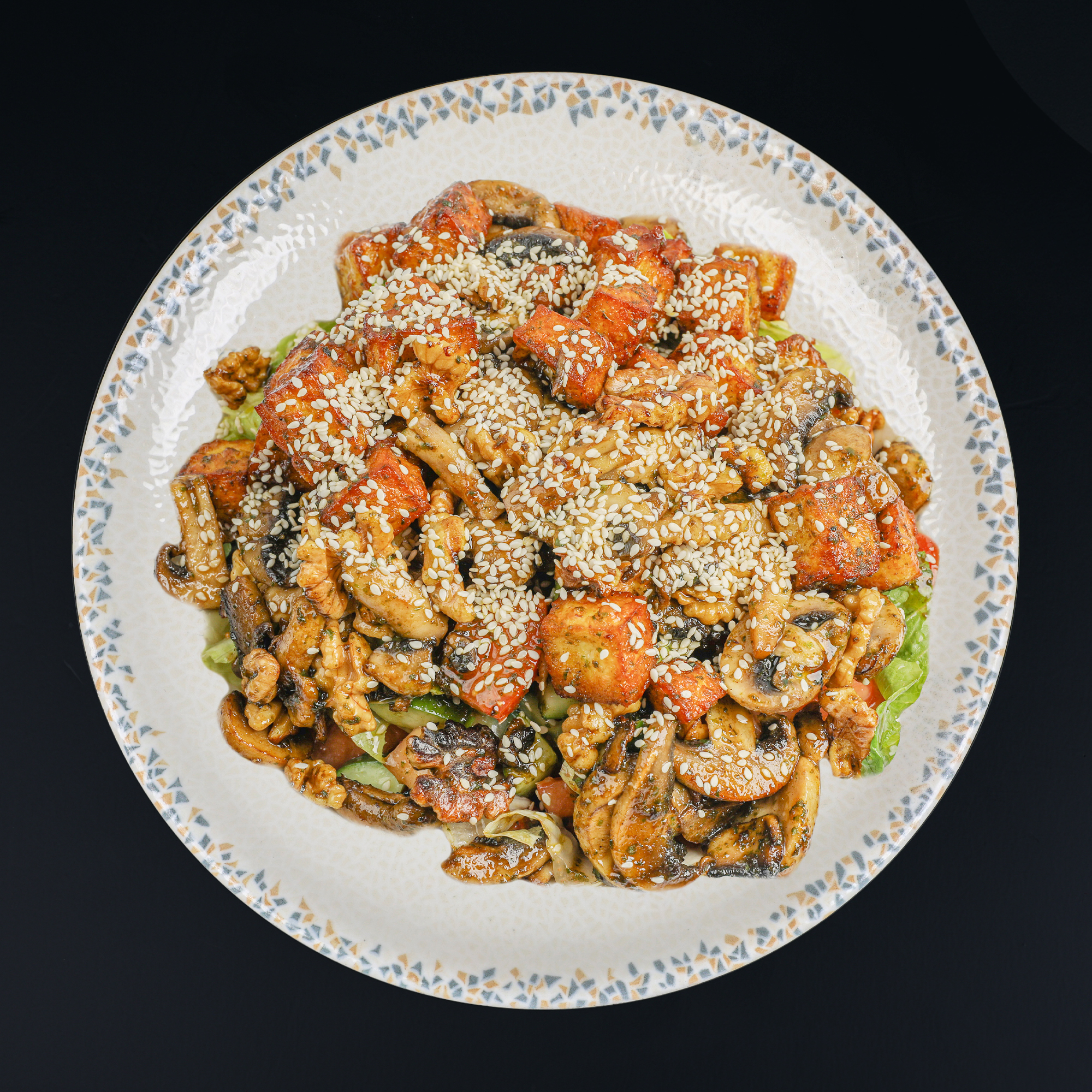 חסה, מלפפון, עגבניות, מעל מוקפץ פטריות עם גבינת חלומי + פסטו ושמשום