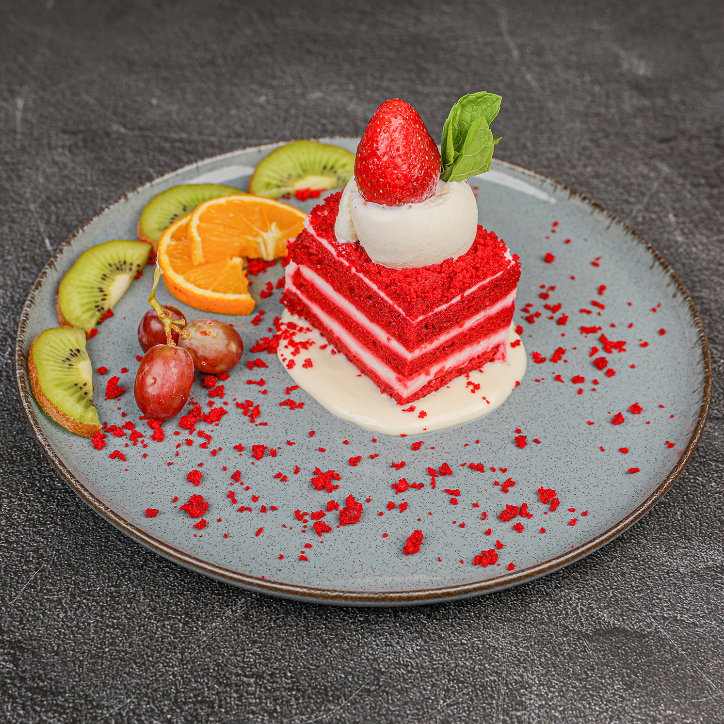 שכבת של עוגת פטל ״קטיפתית״. וקרם גבינה וניל