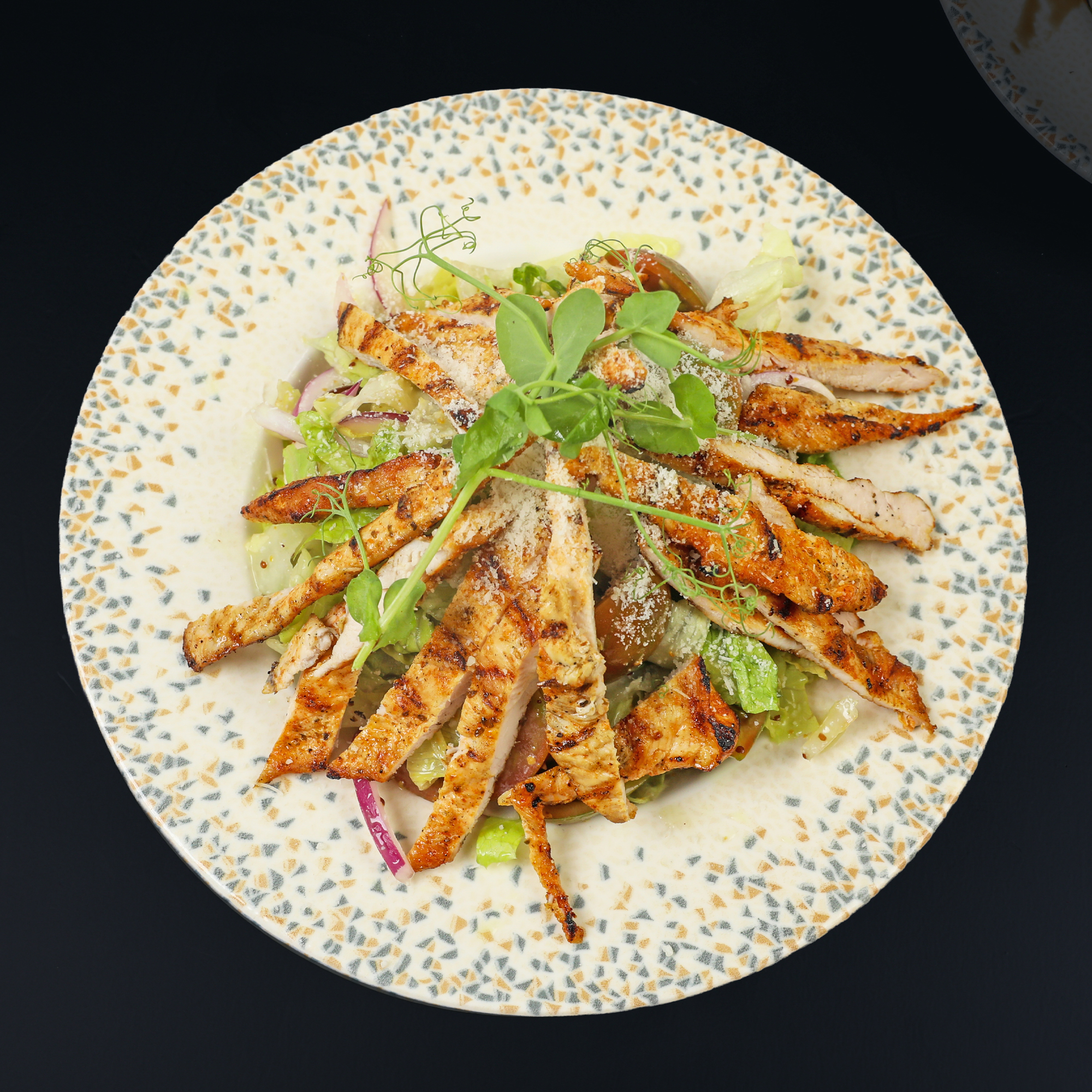 חסה, שירי, בצל סגול, רוצועות עוף, גבינה, פרמיזן